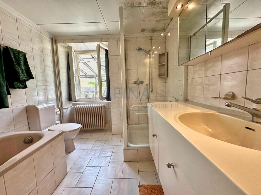 Au rez-de-chaussée, vous découvrirez un logement partiellement rénové en 2022, alliant confort moderne et charme de l’ancien, avec parquet neuf et poutres apparentes. L’espace de vie comprend un grand séjour lumineux avec cheminée, une cuisine fonctionnelle, trois chambres, ainsi qu’une salle de bains équipée d’une baignoire et d’une douche.